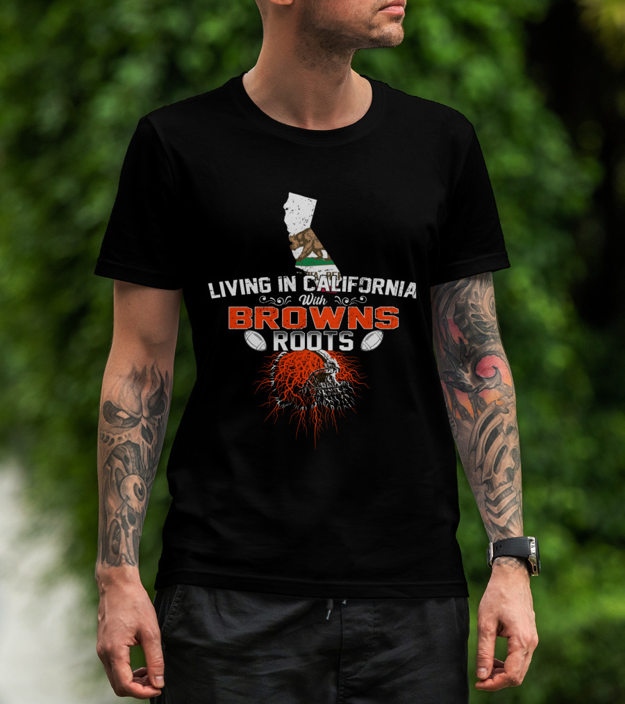 Living In California With Browns Roots Football Helmet California Flag T-Shirt