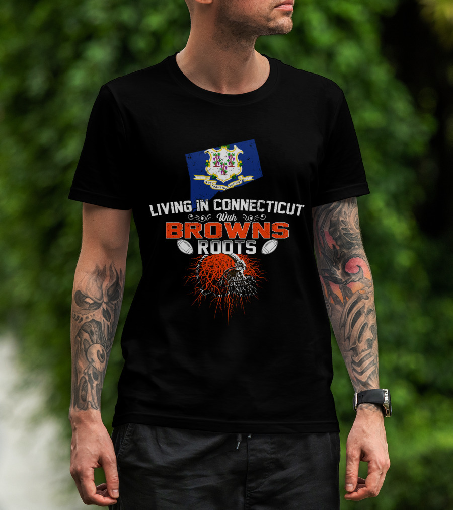 Living In Connecticut With Browns Roots Football Helmet And State Crest T-Shirt