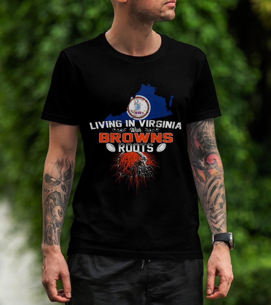 Living In Virginia With Browns Roots Football Helmet And Virginia State Map T-Shirt