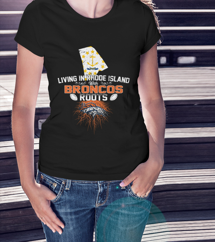 Living In Rhode Island With Broncos Football Roots And Rhode Island Map With Anchor And Hope Stars T-Shirt