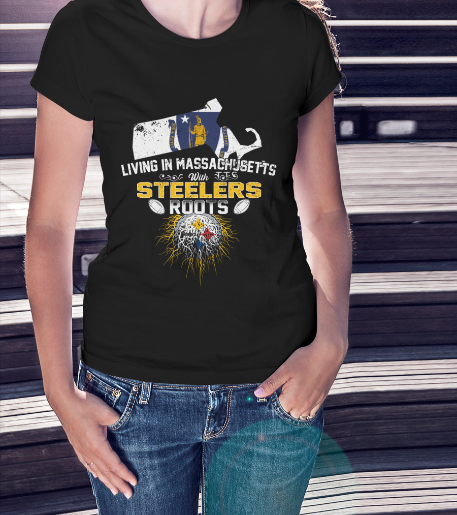 The Living In Massachusetts With Steelers Roots T-shirt is designed for everyday wear and a consistent fit. Fabric is pre-shrunk ring-spun cotton with durable stitching. See the size chart below for exact measurements.