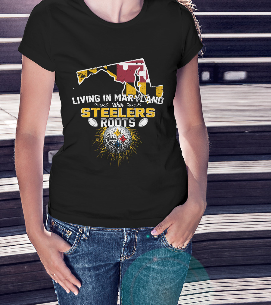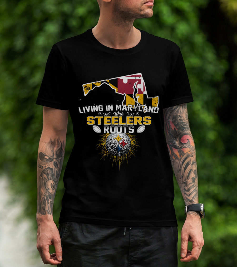 The Living In Maryland With Steelers Roots T-shirt is designed for everyday wear and a consistent fit. Fabric is pre-shrunk ring-spun cotton with durable stitching. See the size chart below for exact measurements.