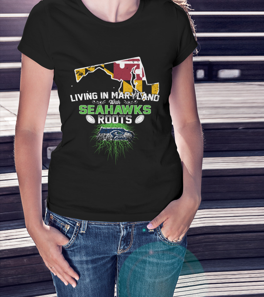 Living In Maryland With Seahawks Roots Maryland Flag And Football Elements T-Shirt
