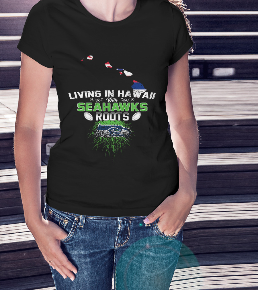 Living In Hawaii With Seahawks Roots Map And Football Graphics T-Shirt