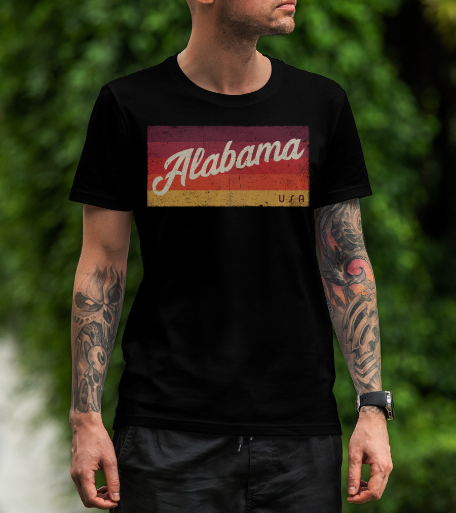 The Alabama USA Vintage Retro Classic State T-shirt is designed for everyday wear and a consistent fit. Fabric is pre-shrunk ring-spun cotton with durable stitching. See the size chart below for exact measurements.
