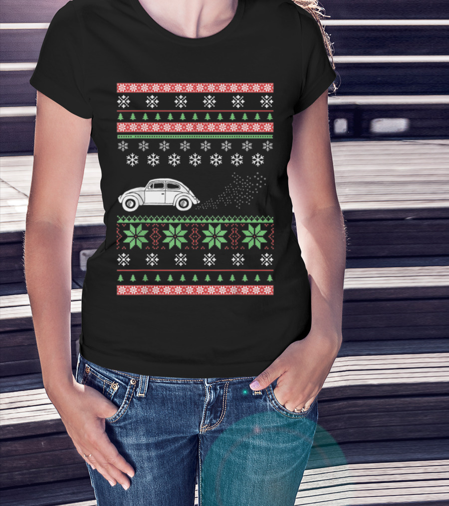 The Classic Car Ugly Christmas Sweater Style Snowflakes and Trees T-shirt is designed for everyday wear and a consistent fit. Fabric is pre-shrunk ring-spun cotton with durable stitching. See the size chart below for exact measurements.