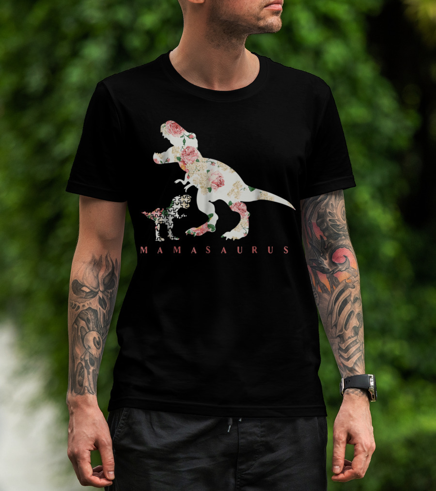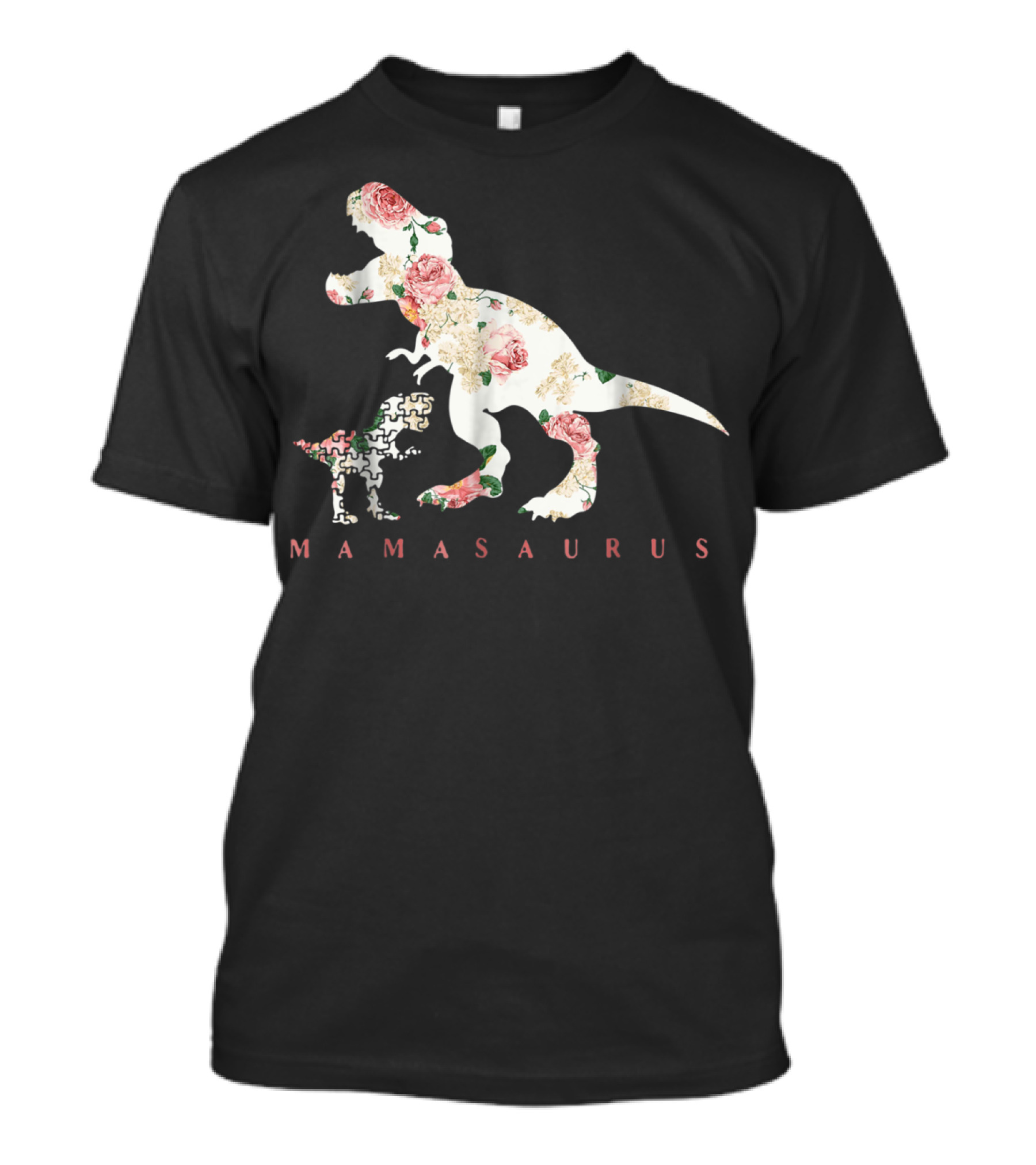 Mamasaurus Autism Awareness Floral Puzzle Dinosaur Mom T-Shirt