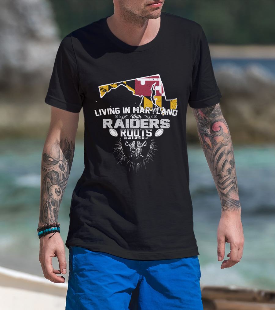 The Living In Maryland With Raiders Roots T-shirt is designed for everyday wear and a consistent fit. Fabric is pre-shrunk ring-spun cotton with durable stitching. See the size chart below for exact measurements.