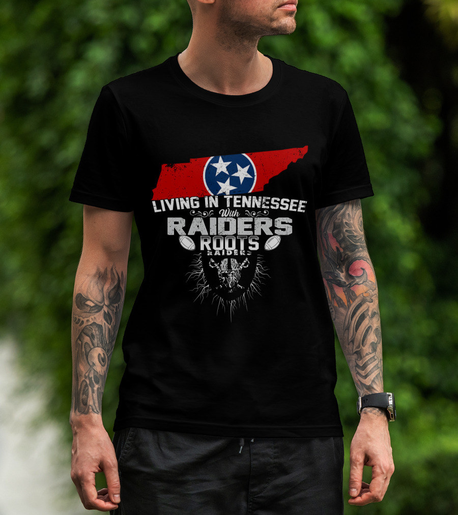 The Living In Tennessee With Raiders Roots T-shirt is designed for everyday wear and a consistent fit. Fabric is pre-shrunk ring-spun cotton with durable stitching. See the size chart below for exact measurements.