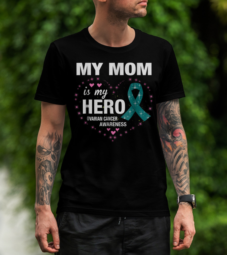 MY MOM Is My HERO Ovarian Cancer Awareness Ribbon Heart And Stars T-Shirt