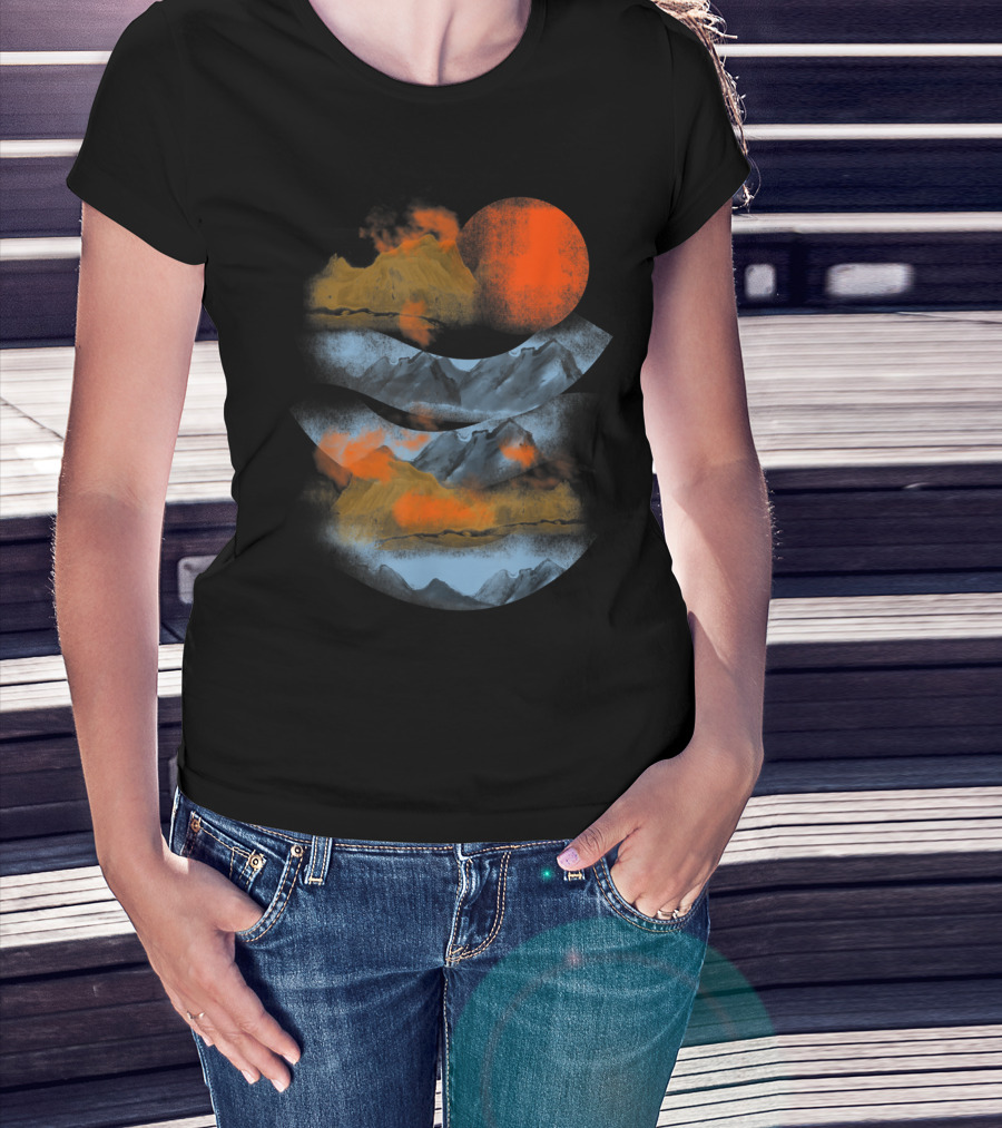 Blurry Mountains Clouds With Red Sun And Smoky Peaks T-Shirt