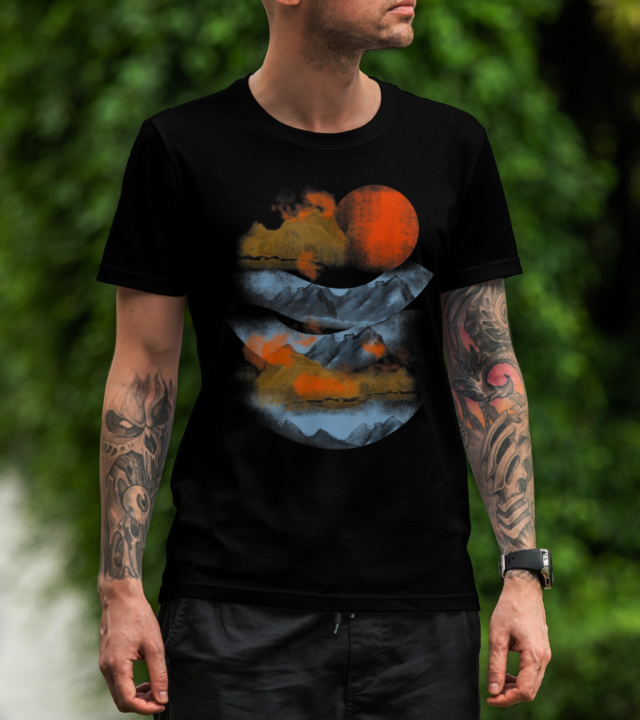 The Blurry Mountains Clouds with Red Sun and Smoky Peaks T-shirt is designed for everyday wear and a consistent fit. Fabric is pre-shrunk ring-spun cotton with durable stitching. See the size chart below for exact measurements.