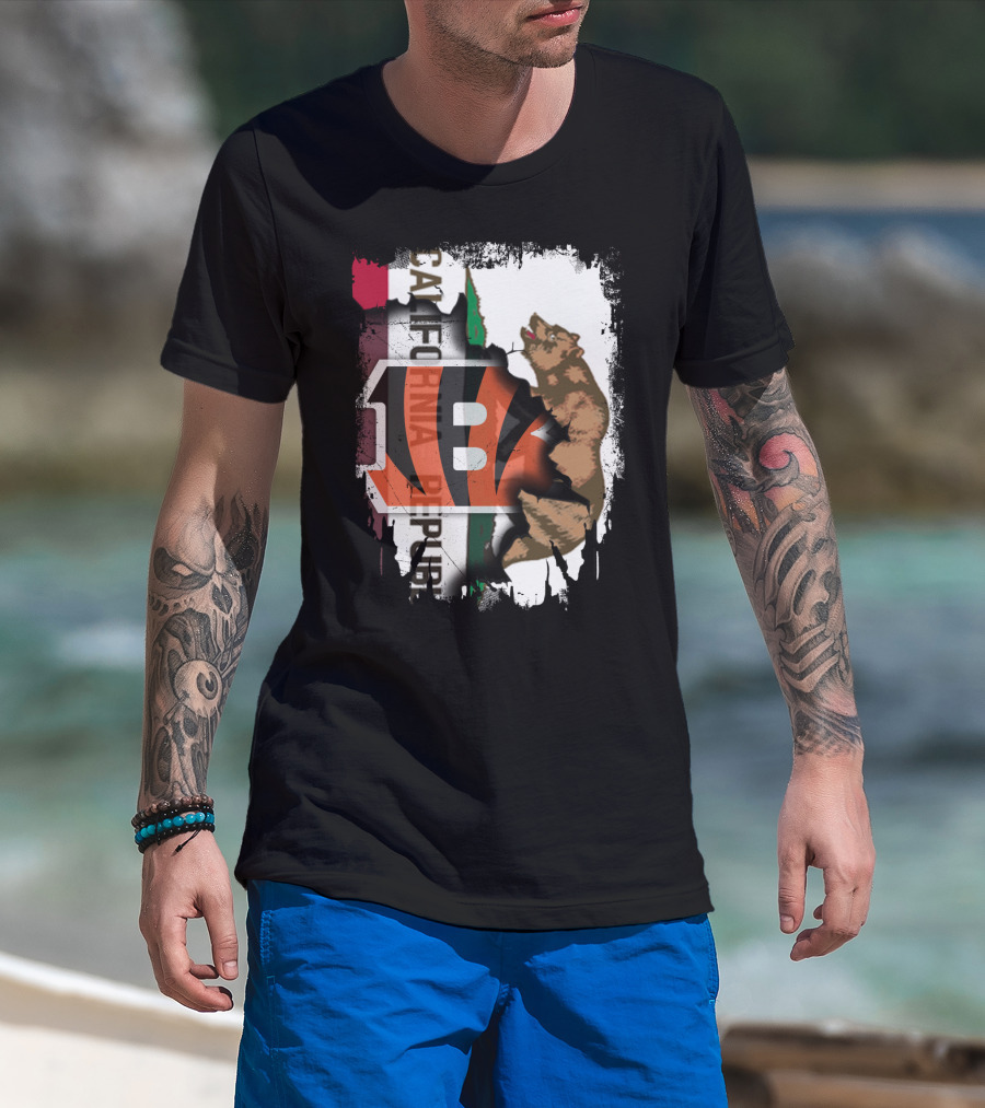 The California Republic Bear With Bengals T-shirt is designed for everyday wear and a consistent fit. Fabric is pre-shrunk ring-spun cotton with durable stitching. See the size chart below for exact measurements.