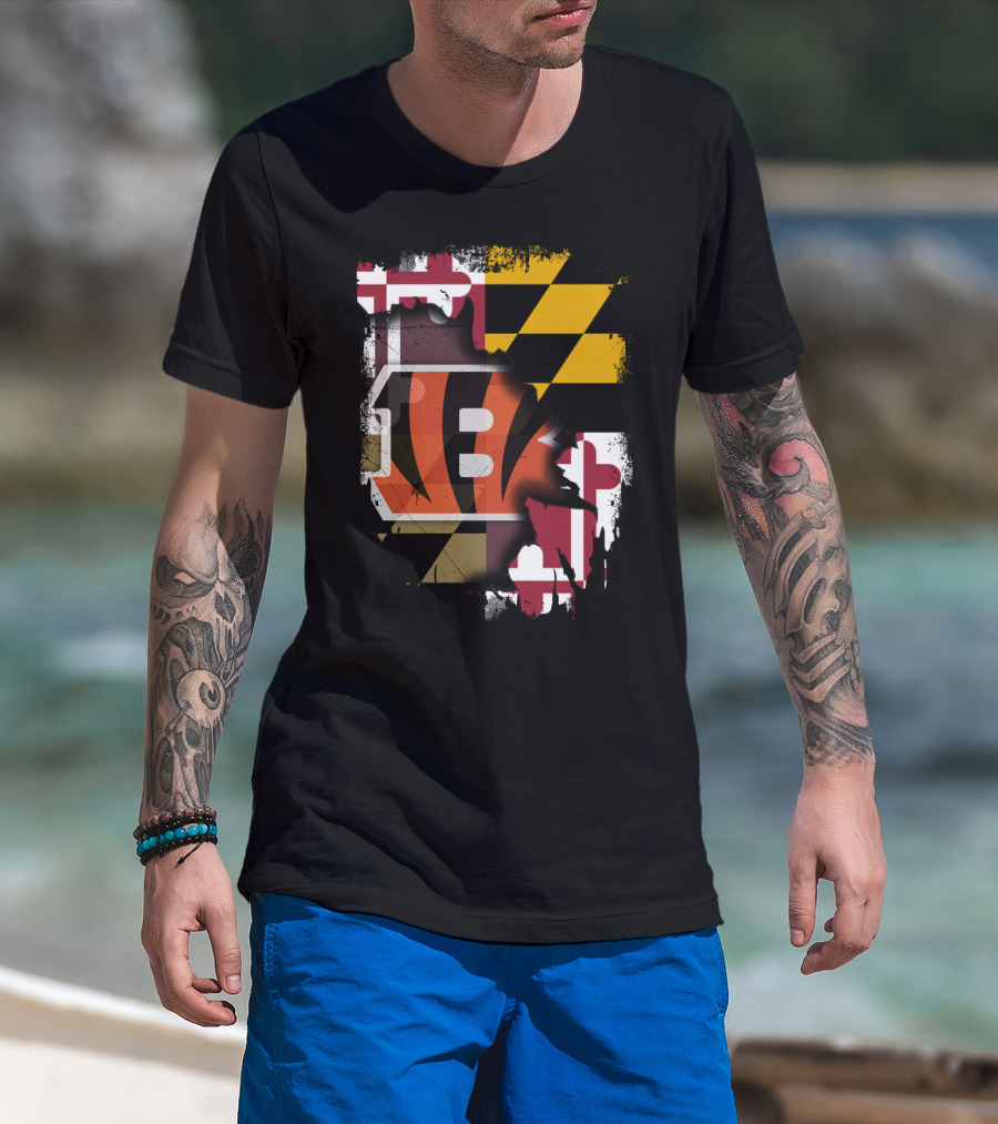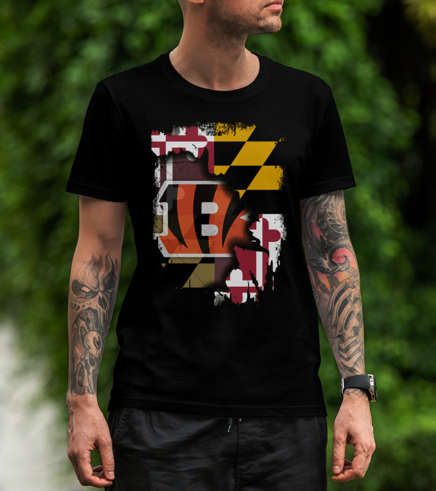 The Maryland Flag Bengals Collaboration T-shirt is designed for everyday wear and a consistent fit. Fabric is pre-shrunk ring-spun cotton with durable stitching. See the size chart below for exact measurements.