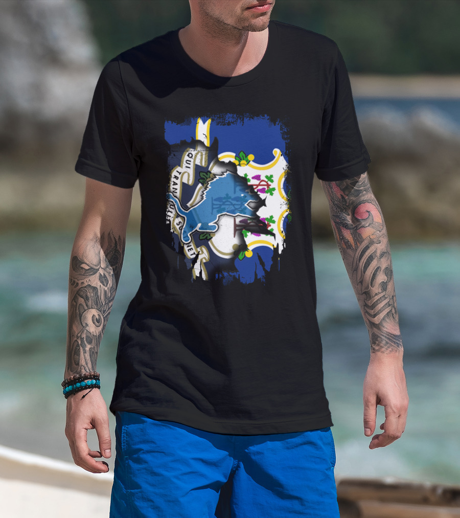 Connecticut State Flag With Detroit Lions Logo Fusion T-Shirt