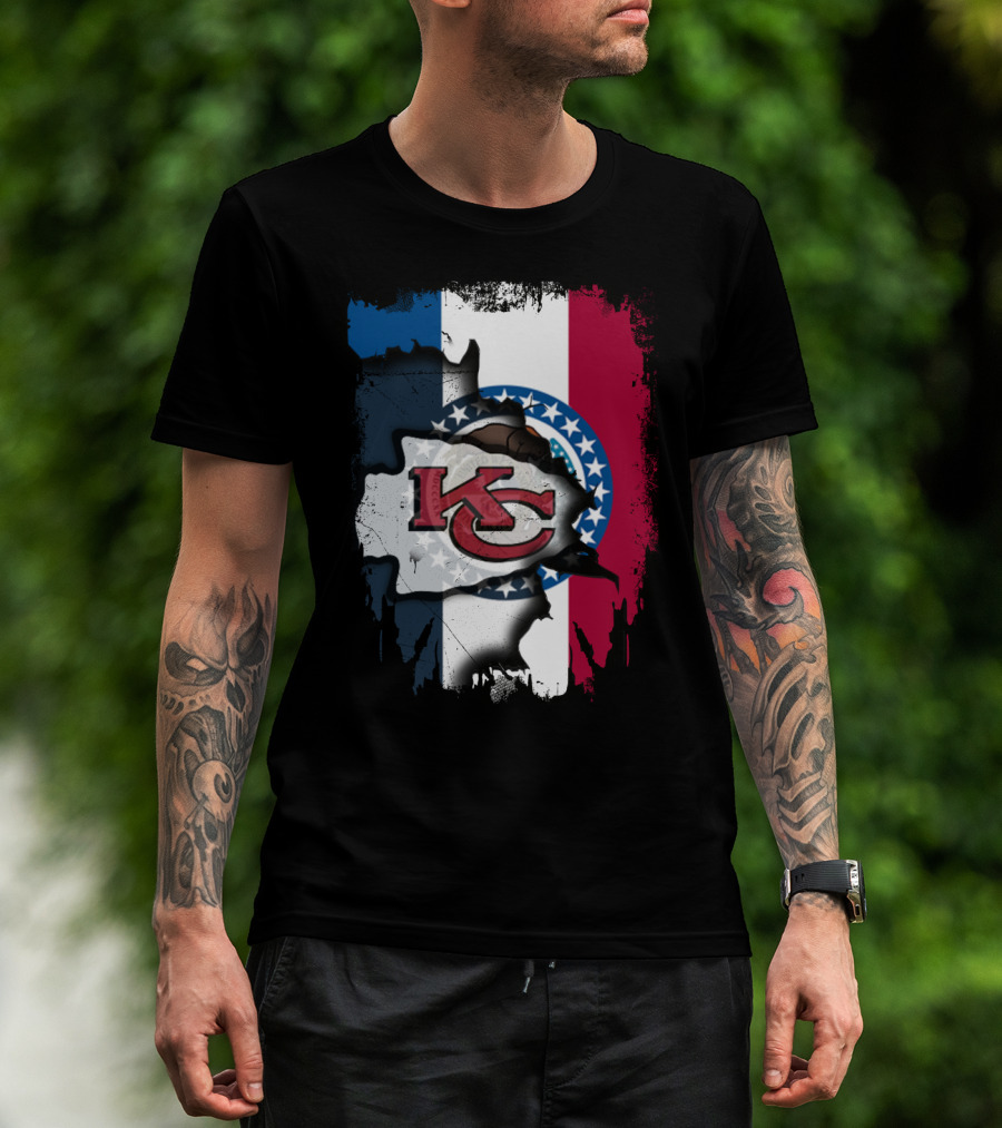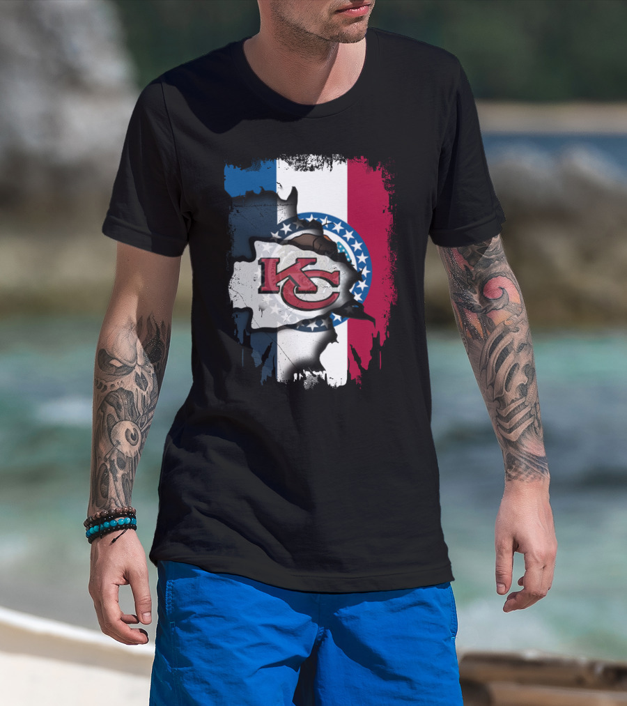 KC Chiefs Logo On Torn Missouri Flag Design Together T-Shirt