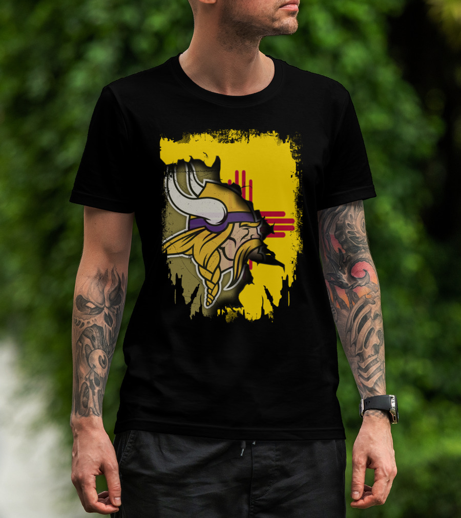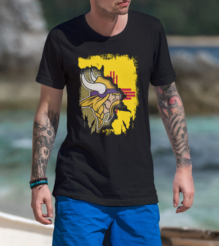 The New Mexico with Vikings and Zia T-shirt is designed for everyday wear and a consistent fit. Fabric is pre-shrunk ring-spun cotton with durable stitching. See the size chart below for exact measurements.