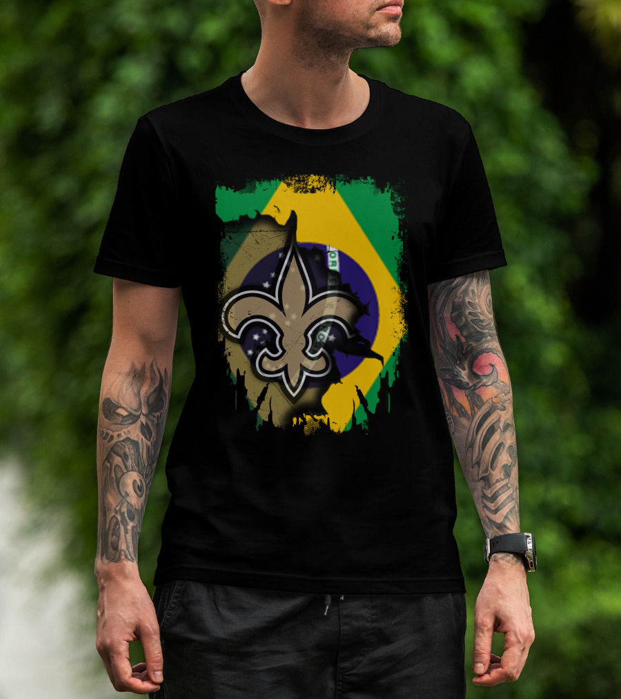 Brazilian Flag With New Orleans Saints Fleur-de-Lis Emblem T-Shirt