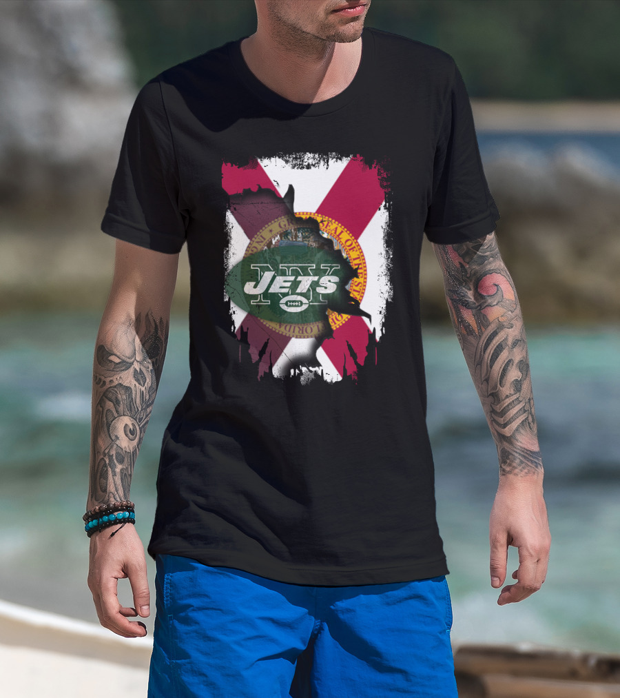 The Florida State Flag New York Jets Collaboration T-shirt is designed for everyday wear and a consistent fit. Fabric is pre-shrunk ring-spun cotton with durable stitching. See the size chart below for exact measurements.