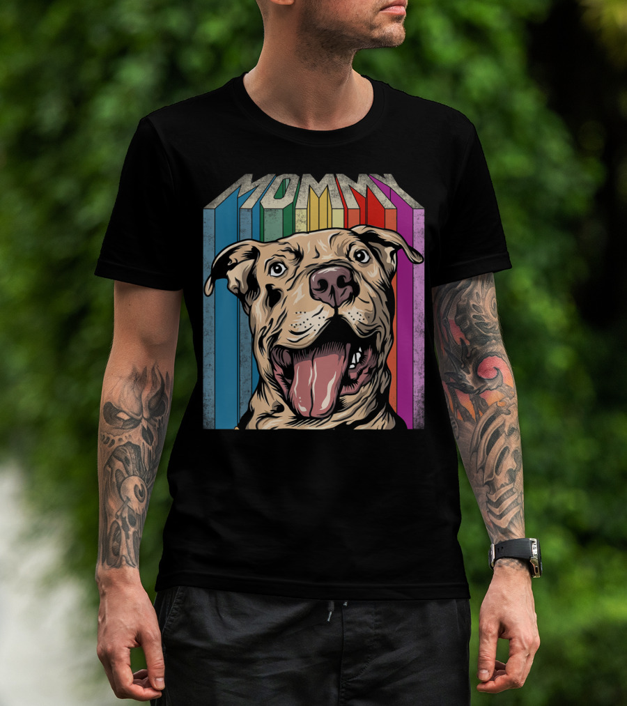 The Mommy Pitbull Dog Retro Colorful Stripes T-shirt is designed for everyday wear and a consistent fit. Fabric is pre-shrunk ring-spun cotton with durable stitching. See the size chart below for exact measurements.