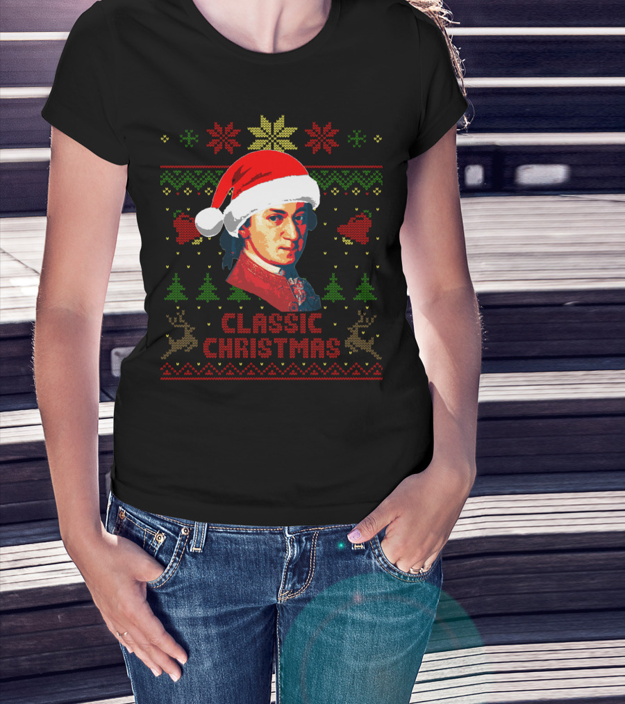 The Classic Christmas Mozart Santa Hat T-shirt is designed for everyday wear and a consistent fit. Fabric is pre-shrunk ring-spun cotton with durable stitching. See the size chart below for exact measurements.