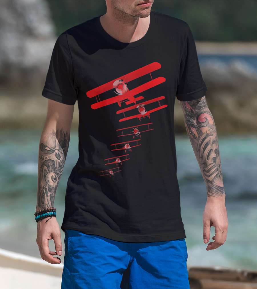 The Classic Red Aviation Biplane Formation T-shirt is designed for everyday wear and a consistent fit. Fabric is pre-shrunk ring-spun cotton with durable stitching. See the size chart below for exact measurements.