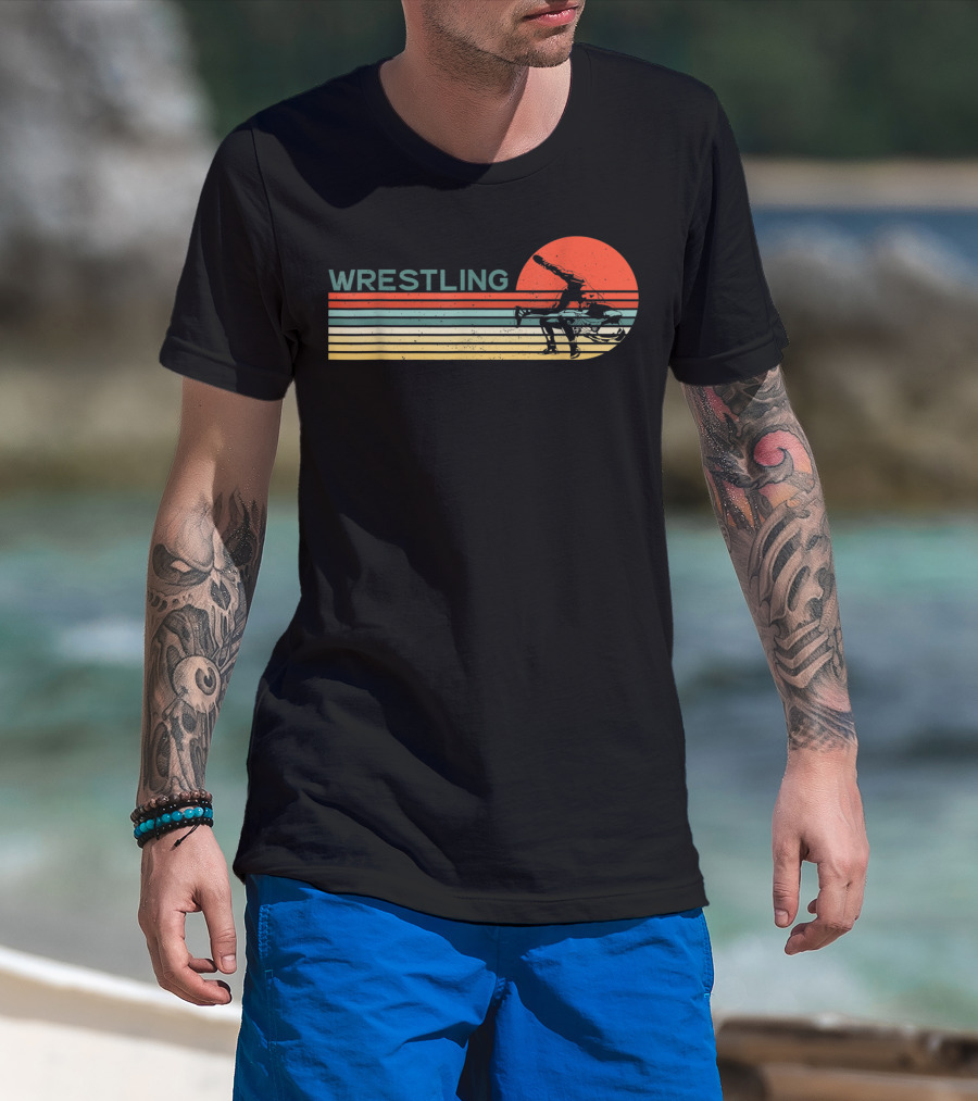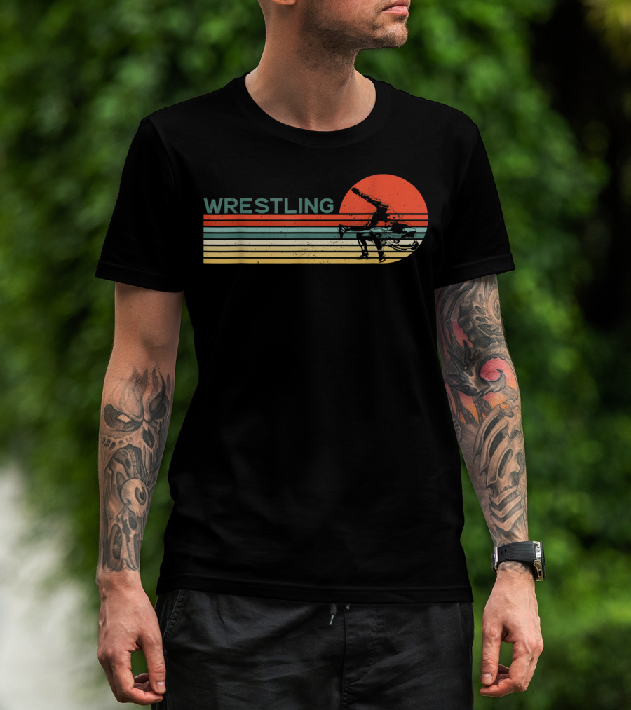 The Wrestling Sunset Silhouette Retro Style Classic Catch Birthday T-shirt is designed for everyday wear and a consistent fit. Fabric is pre-shrunk ring-spun cotton with durable stitching. See the size chart below for exact measurements.