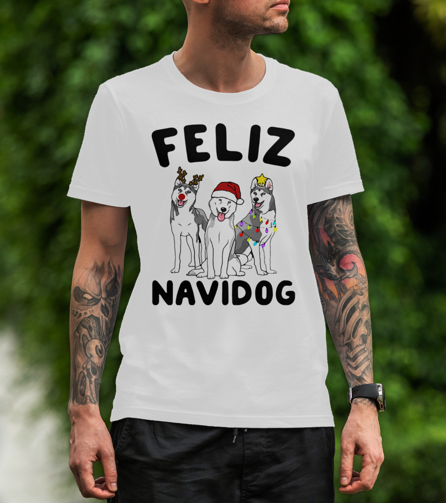 Feliz Navidog Husky Reindeer Santa Lights T-Shirt