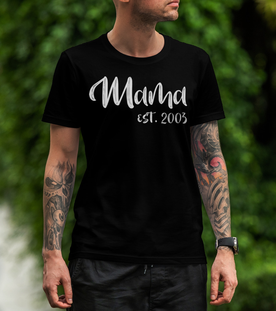 The Mama Est. 2003 T-shirt is designed for everyday wear and a consistent fit. Fabric is pre-shrunk ring-spun cotton with durable stitching. See the size chart below for exact measurements.