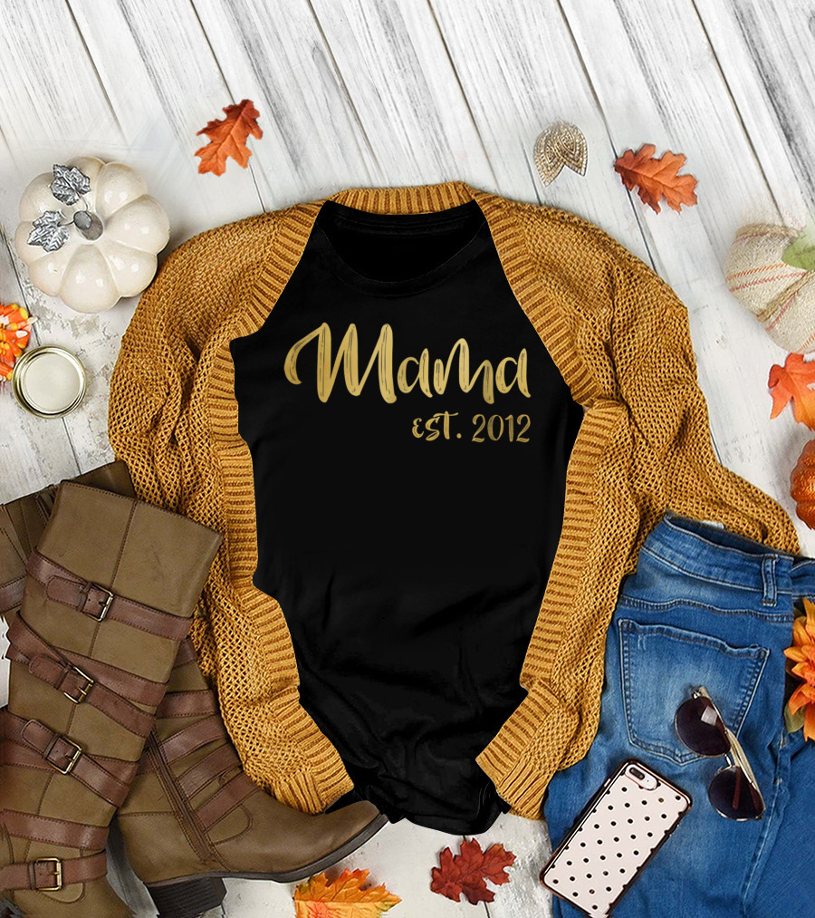 The Mama Est. 2012 Gold Text for Mom63 T-shirt is designed for everyday wear and a consistent fit. Fabric is pre-shrunk ring-spun cotton with durable stitching. See the size chart below for exact measurements.