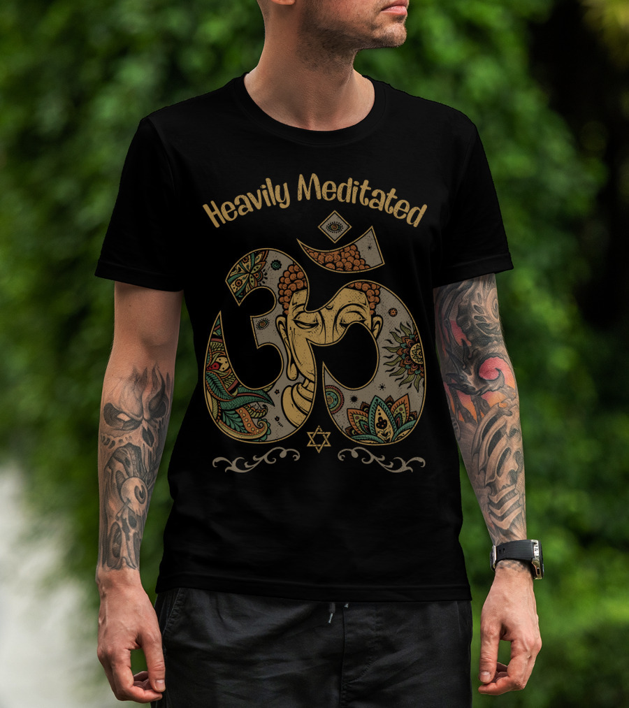 The Heavily Meditated Om Symbol with Buddha Face and Mandala T-shirt is designed for everyday wear and a consistent fit. Fabric is pre-shrunk ring-spun cotton with durable stitching. See the size chart below for exact measurements.