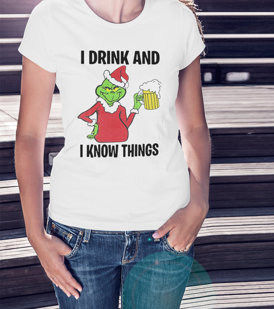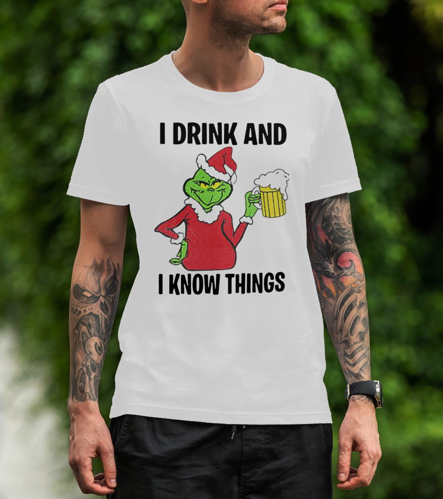 Grinch Santa Holding Beer I Drink And I Know Things T-Shirt
