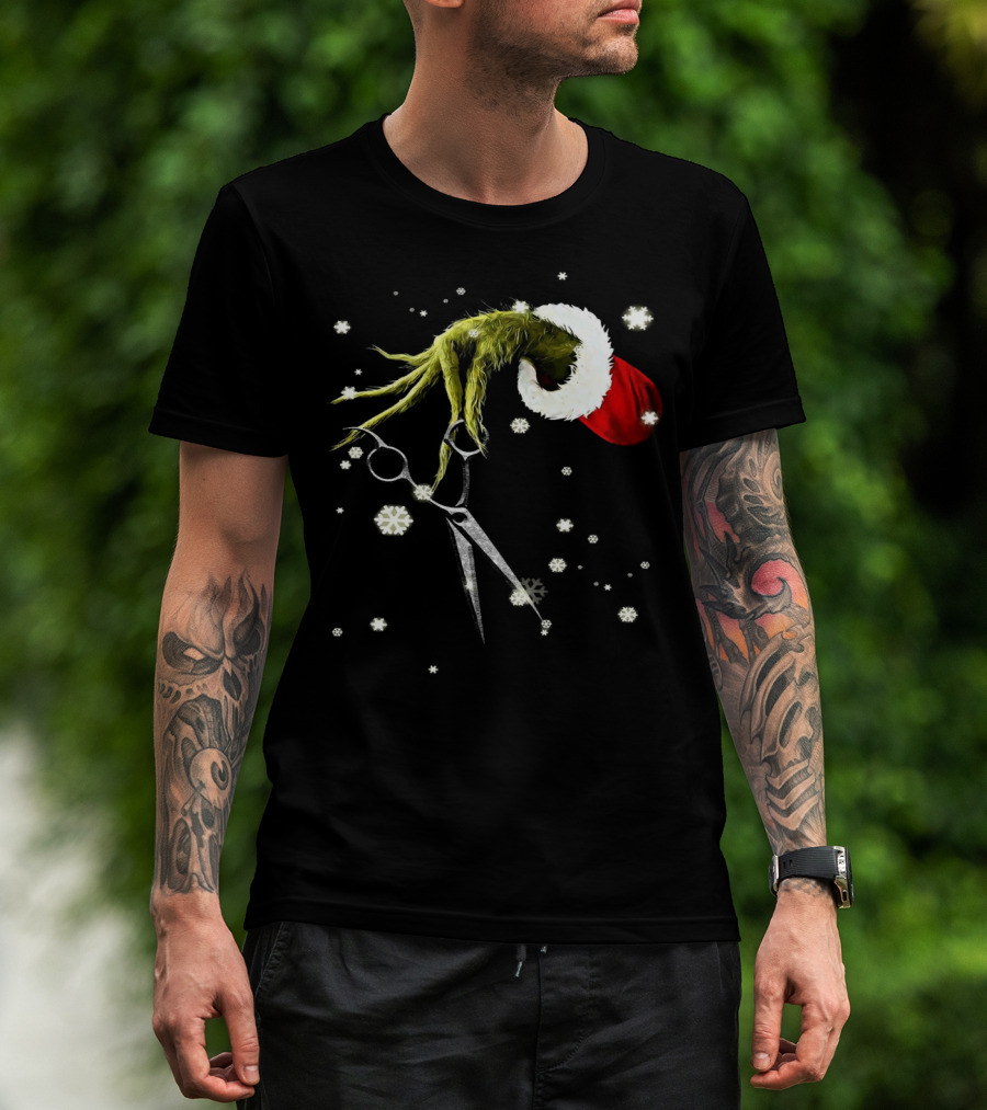 Grinch Hand Holding Scissors Santa Hat Snowflakes T-Shirt
