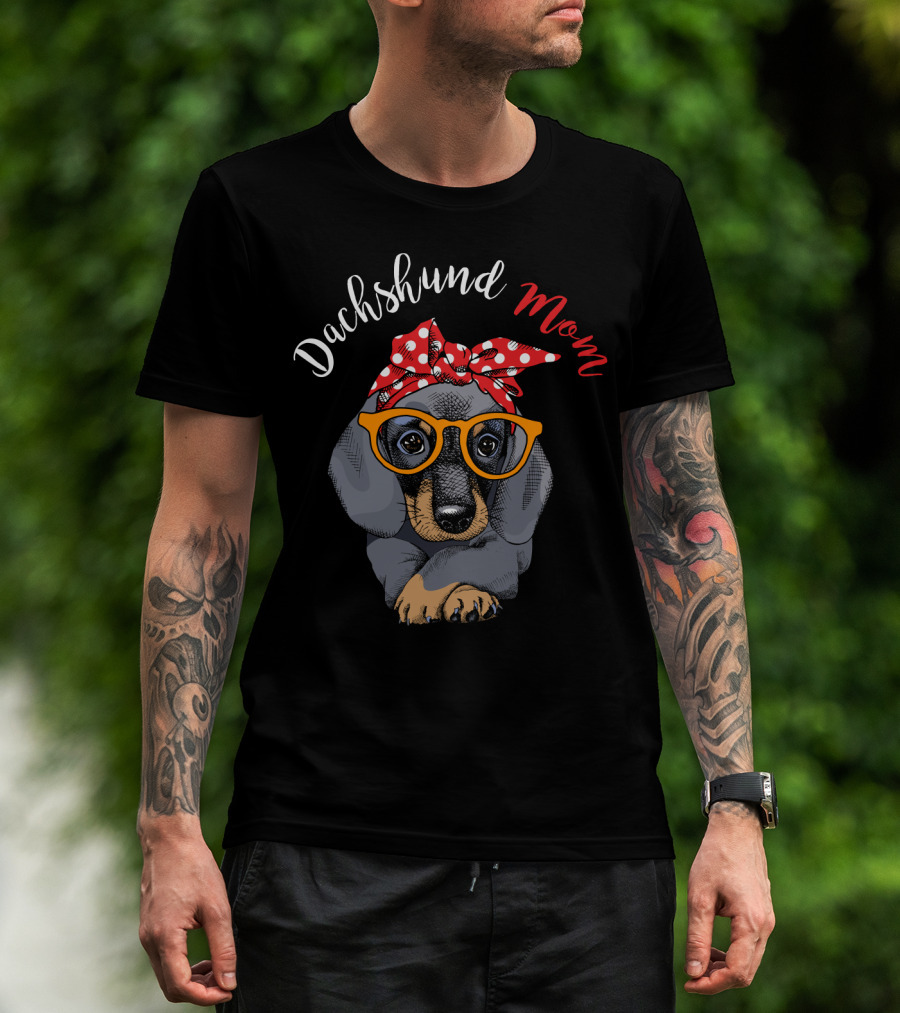 Dachshund Mom Red Polka Dot Turban And Glasses T-Shirt