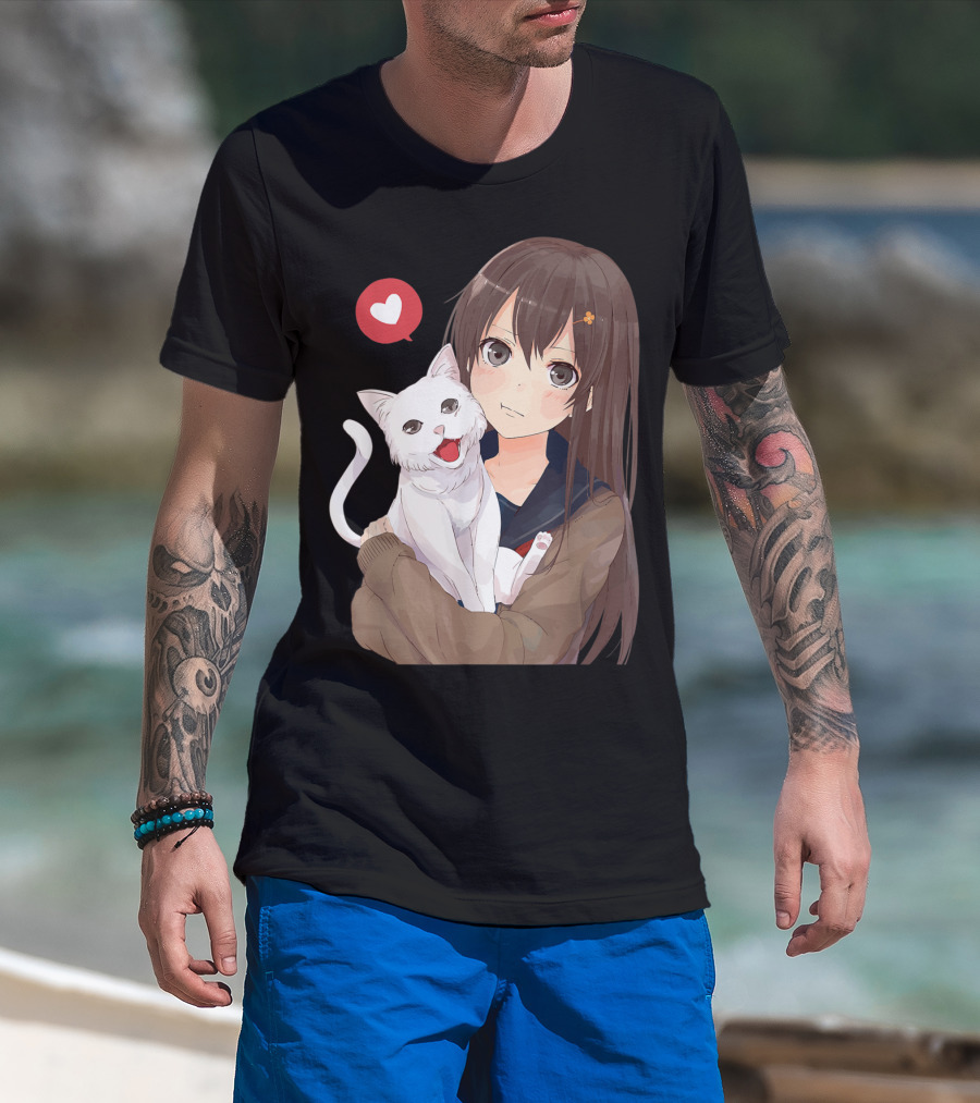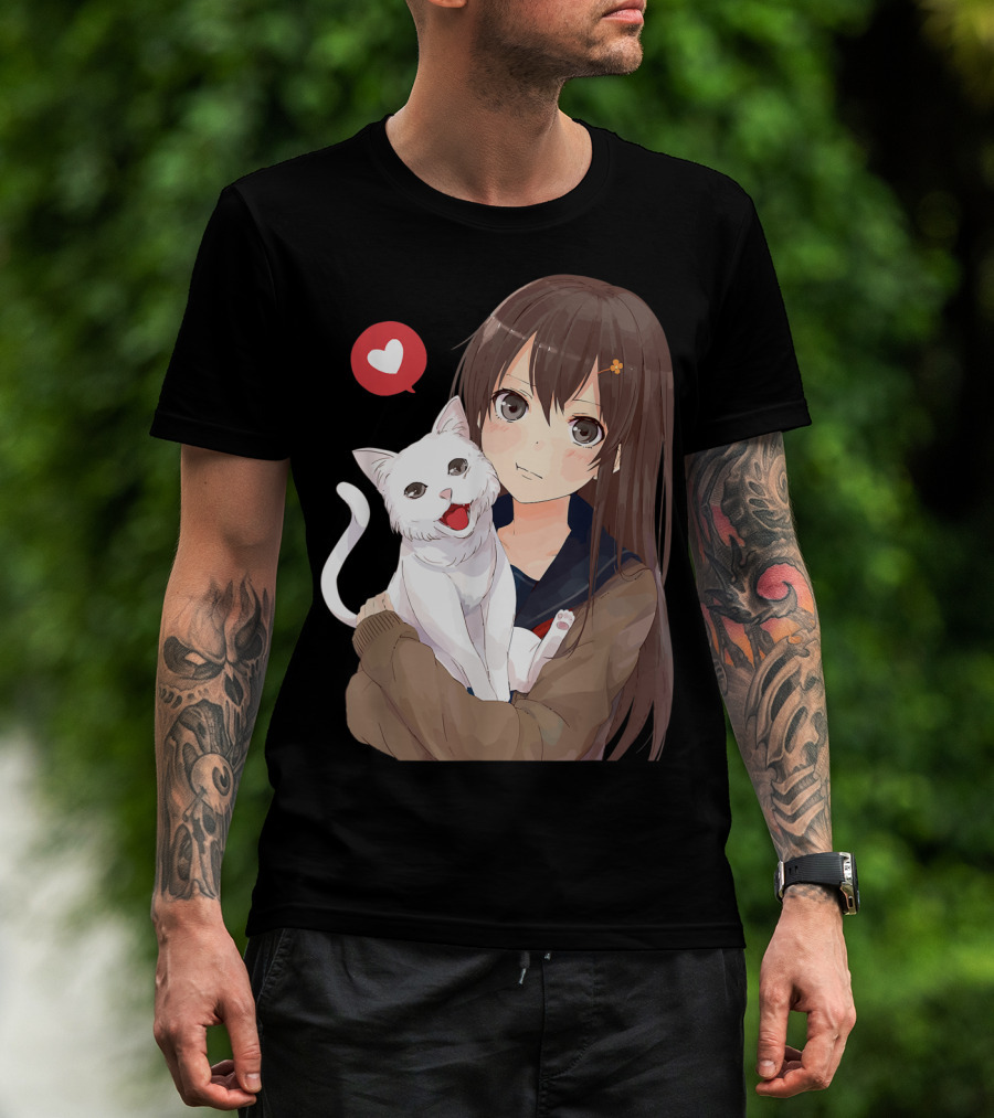 Cute Anime Girl With Adorable White Kitty Cat And Heart T-Shirt