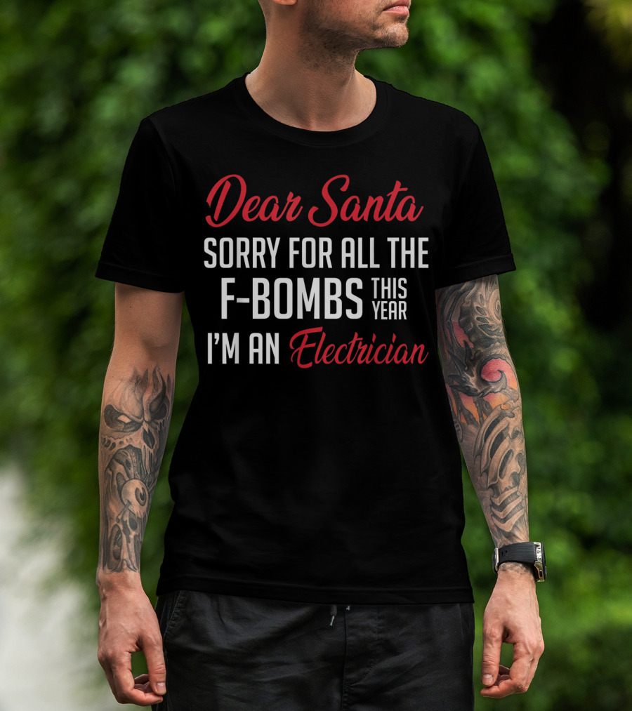 The Dear Santa Sorry for All the F-Bombs This Year I'm an Electrician T-shirt is designed for everyday wear and a consistent fit. Fabric is pre-shrunk ring-spun cotton with durable stitching. See the size chart below for exact measurements.