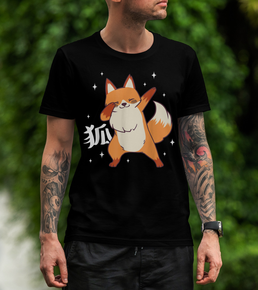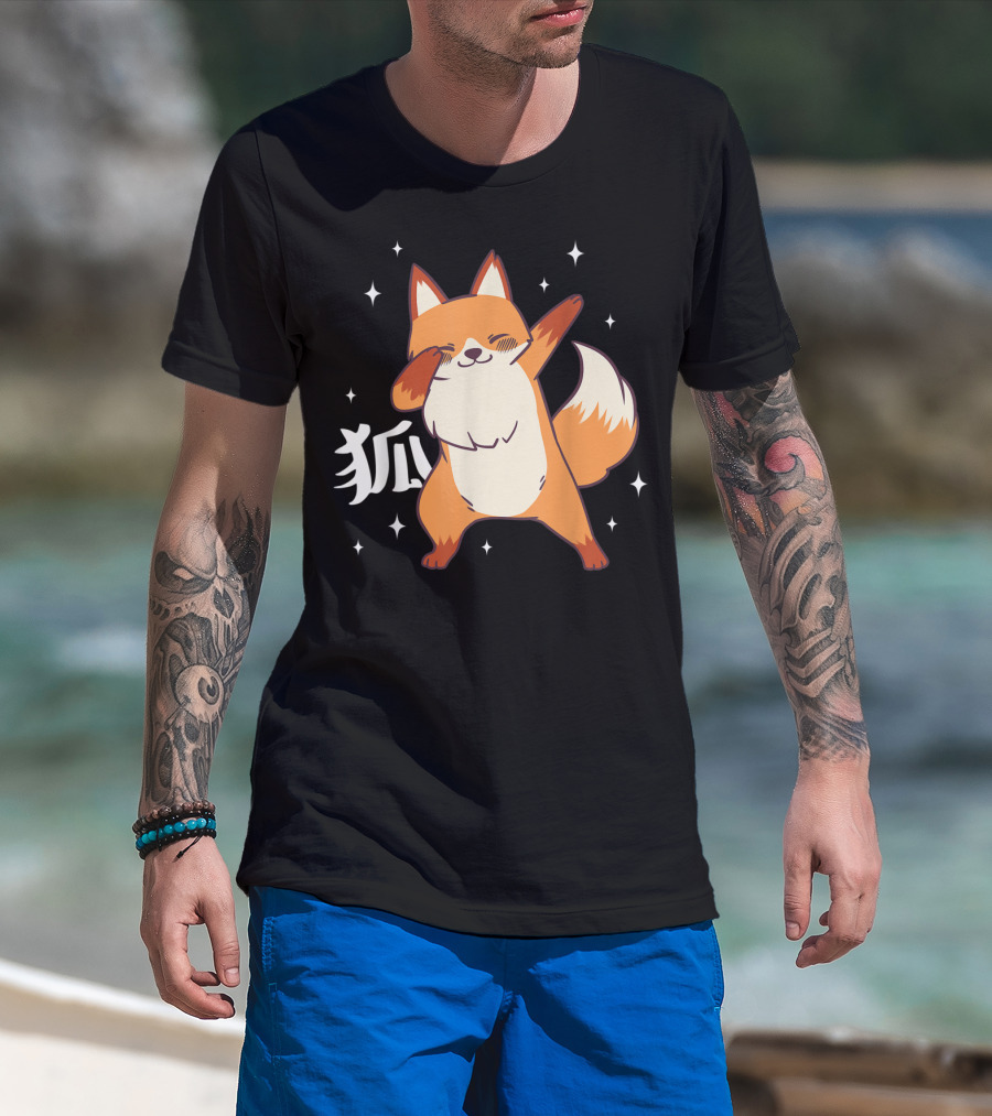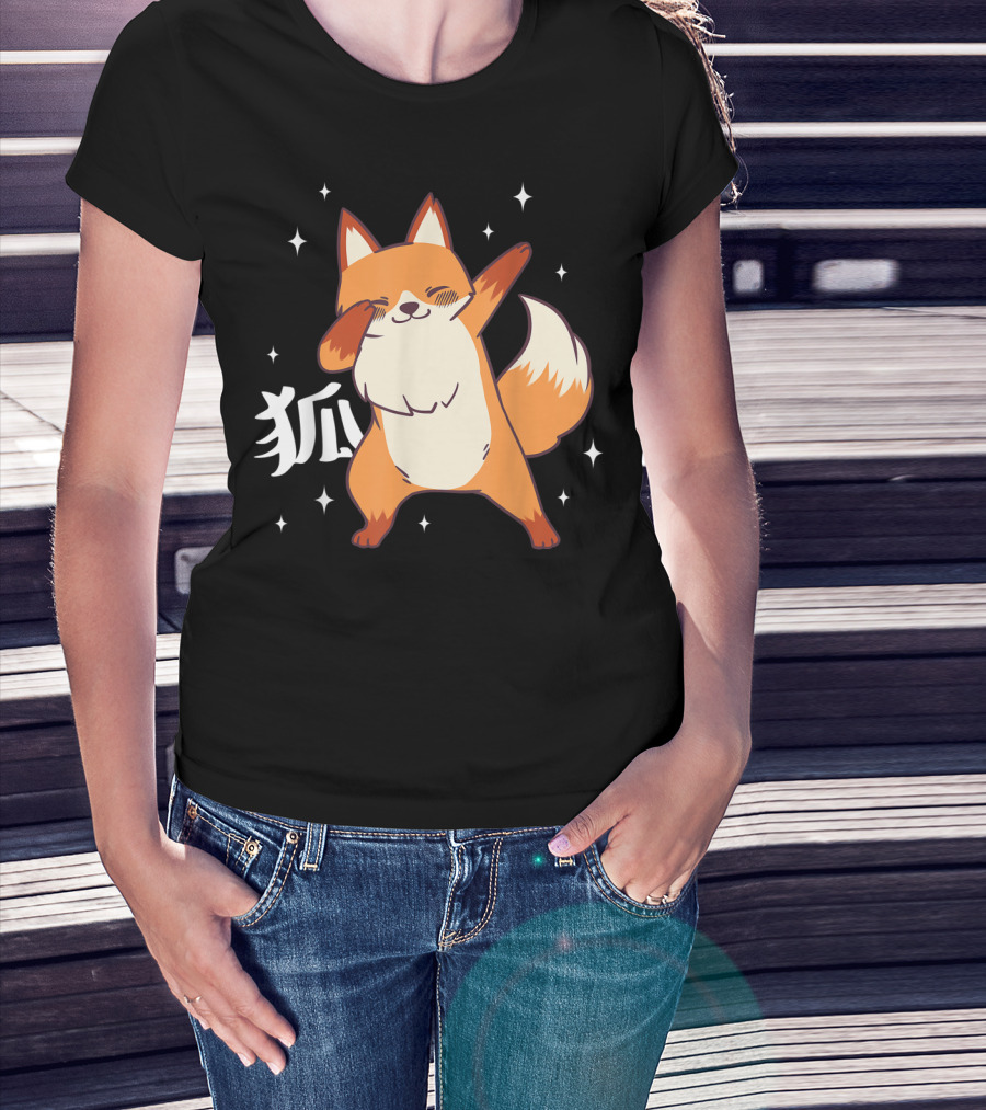 Fox Dabbing Kawaii Kitsune Japanese Kanji Stars T-Shirt