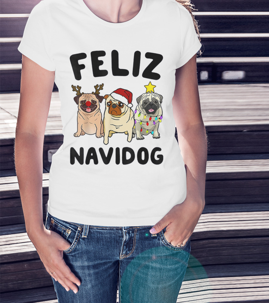 Feliz Navidog Pugs Christmas Antlers Santa Hat Lights T-Shirt