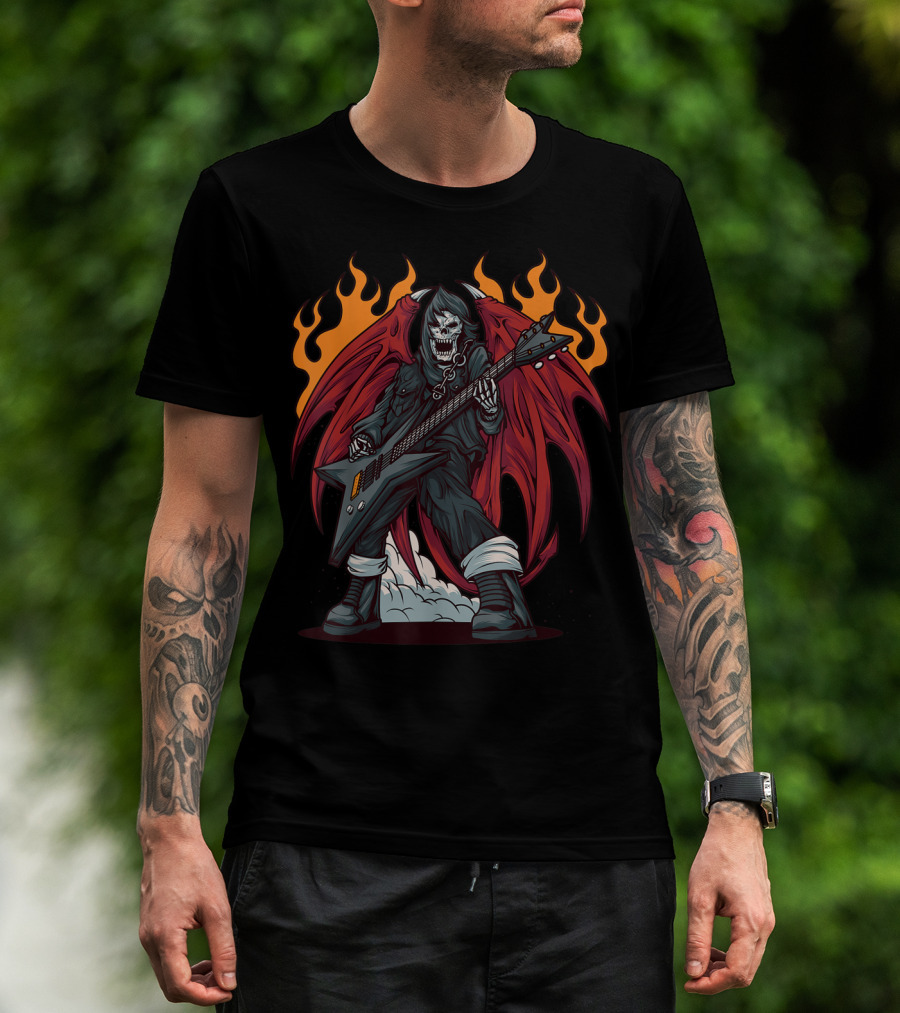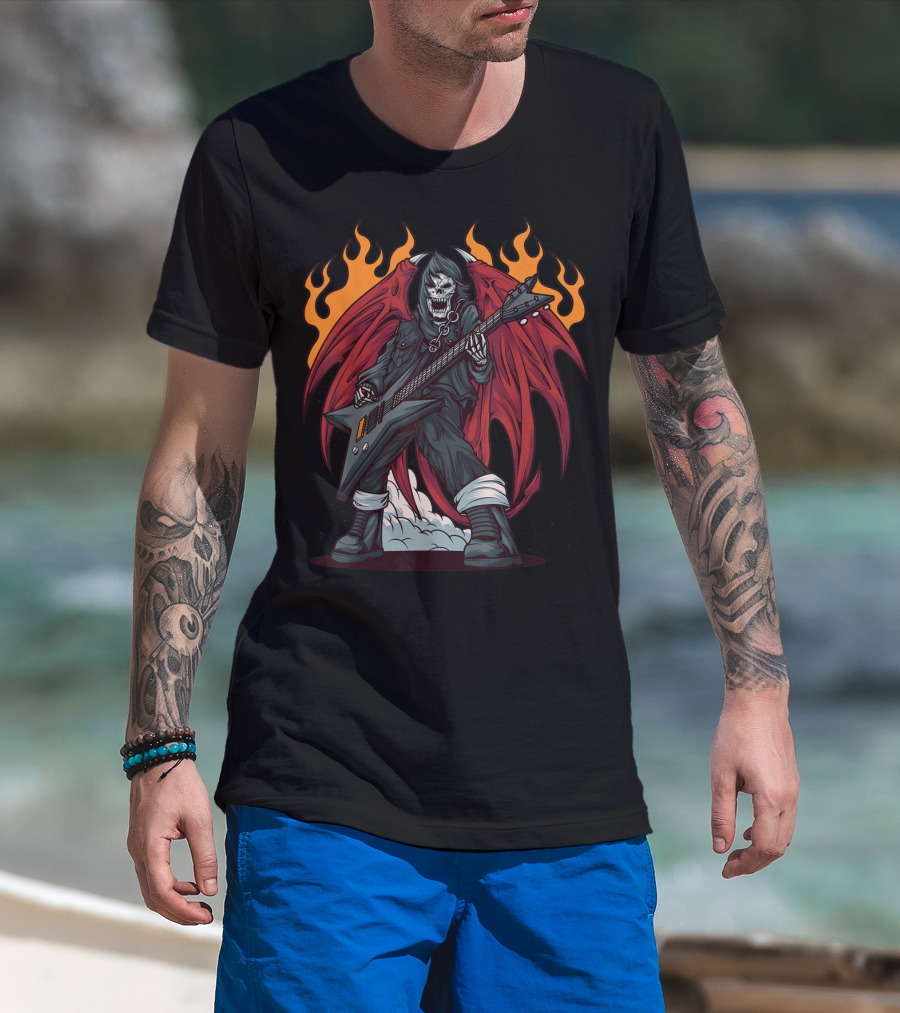 Heavy Metal Guitarist Red Winged Flaming Skull T-Shirt