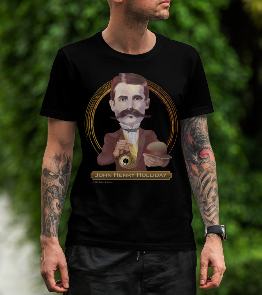 The John Henry Holliday Wild West Legend Holding Pocket Watch and Bowler Hat T-shirt is designed for everyday wear and a consistent fit. Fabric is pre-shrunk ring-spun cotton with durable stitching. See the size chart below for exact measurements.