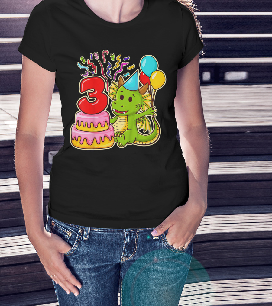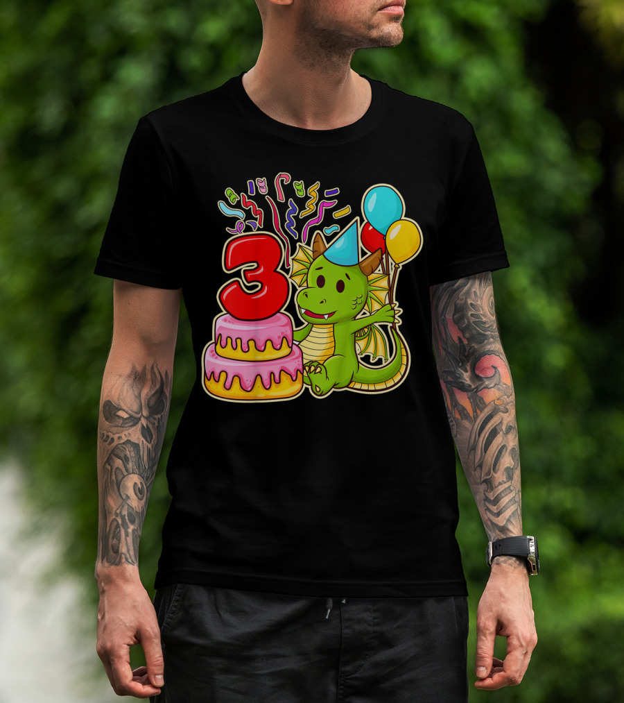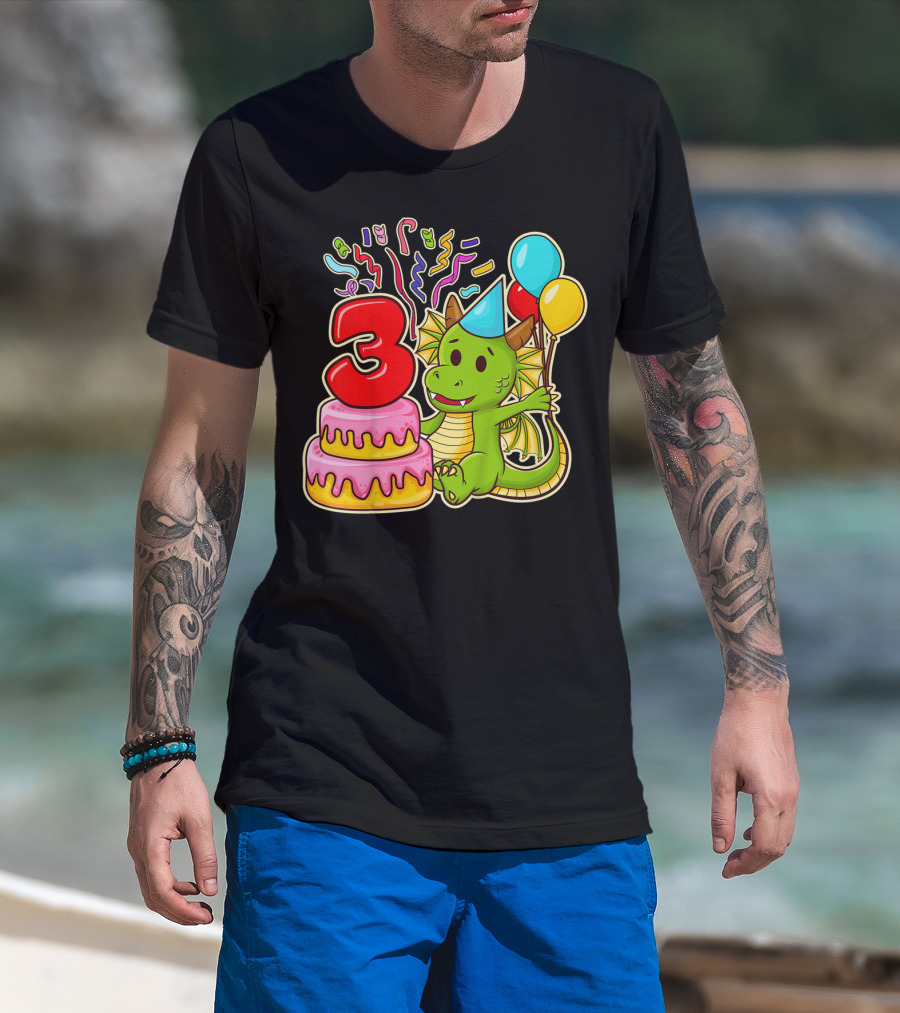 Kids 3rd Birthday Dragon Party Cake Balloons Confetti 3 Year Old T-Shirt