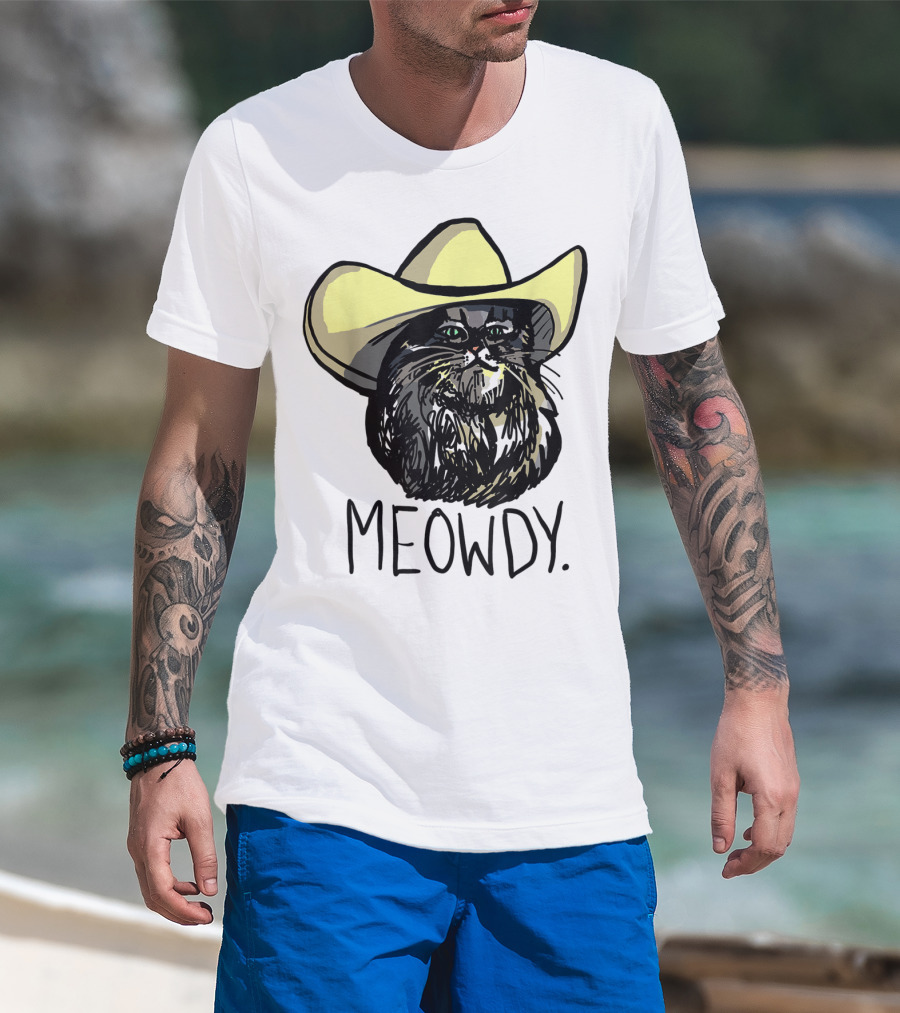 The MEOWDY Texas Cowboy Cat T-shirt is designed for everyday wear and a consistent fit. Fabric is pre-shrunk ring-spun cotton with durable stitching. See the size chart below for exact measurements.