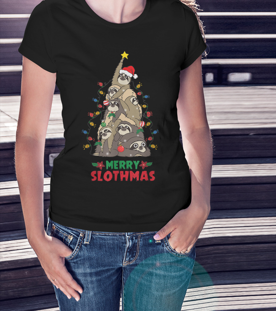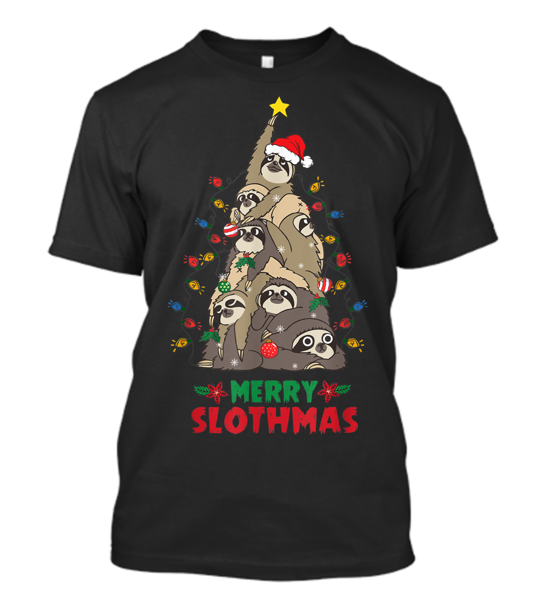The Merry Slothmas Sloth Christmas Tree with Holiday Lights and Santa Hat T-shirt is designed for everyday wear and a consistent fit. Fabric is pre-shrunk ring-spun cotton with durable stitching. See the size chart below for exact measurements.