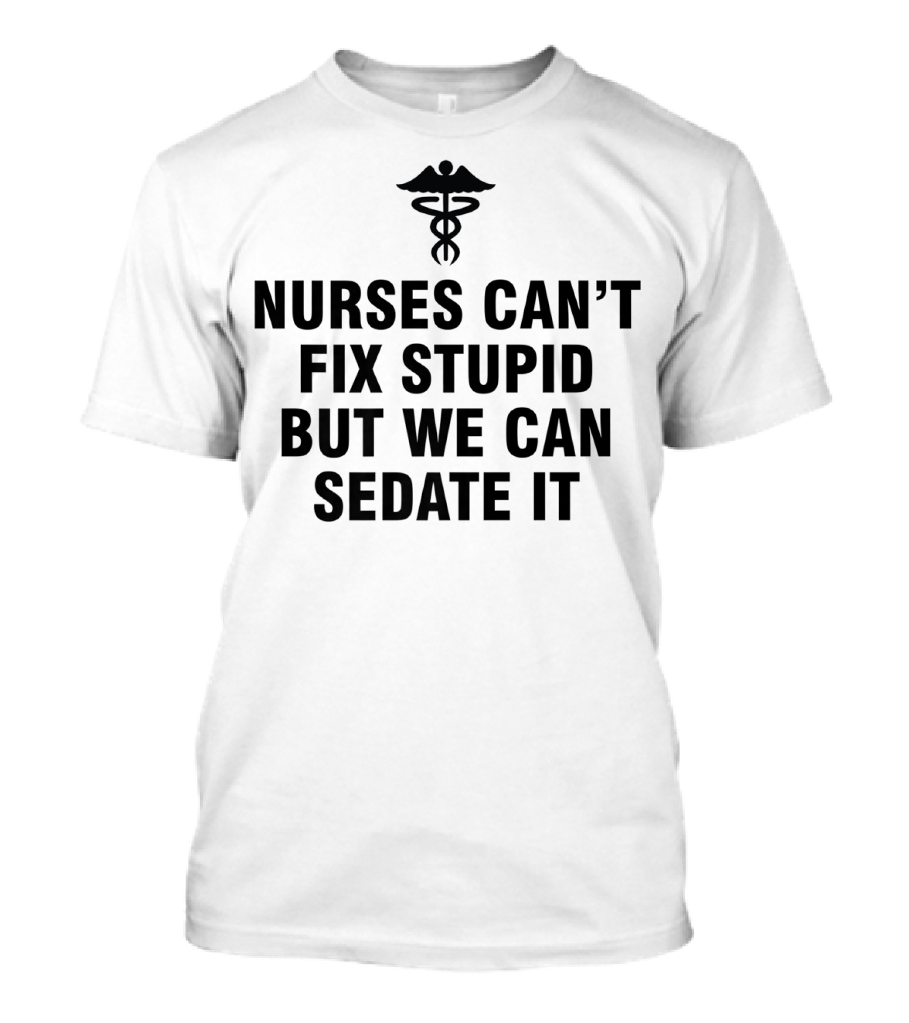 The Nurses Can't Fix Stupid But We Can Sedate It Medical Symbol Caduceus T-shirt is designed for everyday wear and a consistent fit. Fabric is pre-shrunk ring-spun cotton with durable stitching. See the size chart below for exact measurements.
