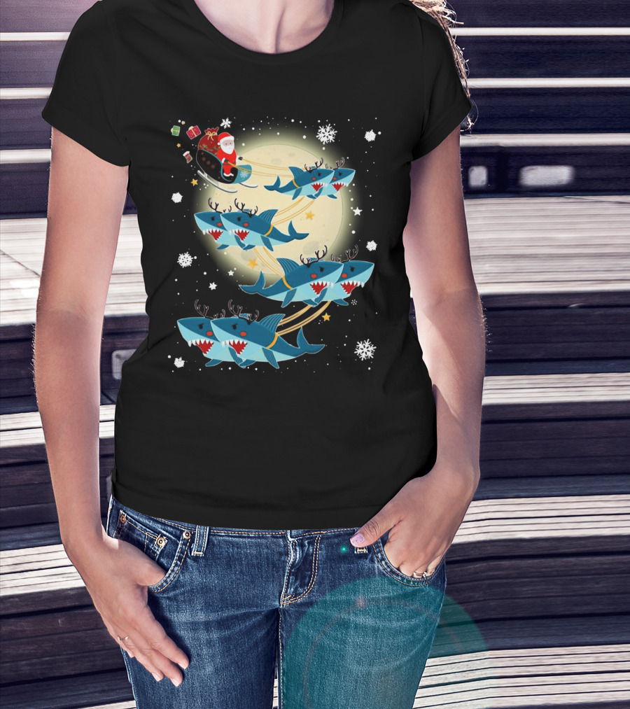 Santa Claus Riding Shark Reindeer Full Moon Snowflakes T-Shirt