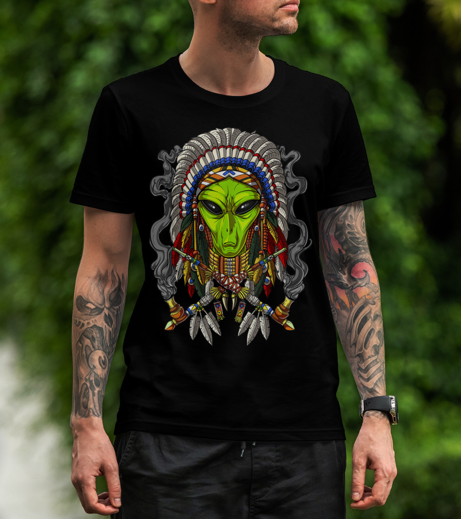 Alien Native American Chief Headdress Smoking Peace Pipes T-Shirt