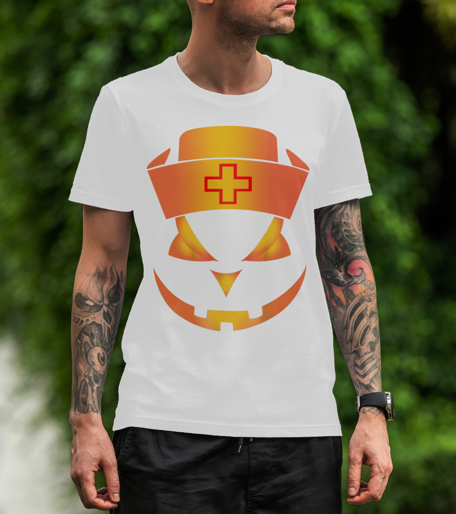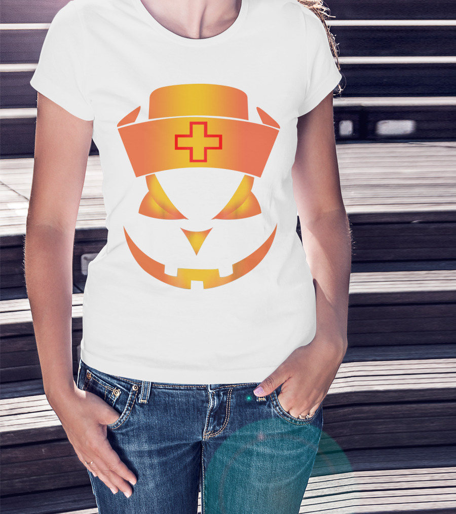 Nurse Pumpkin Face With Cross Hat Halloween T-Shirt