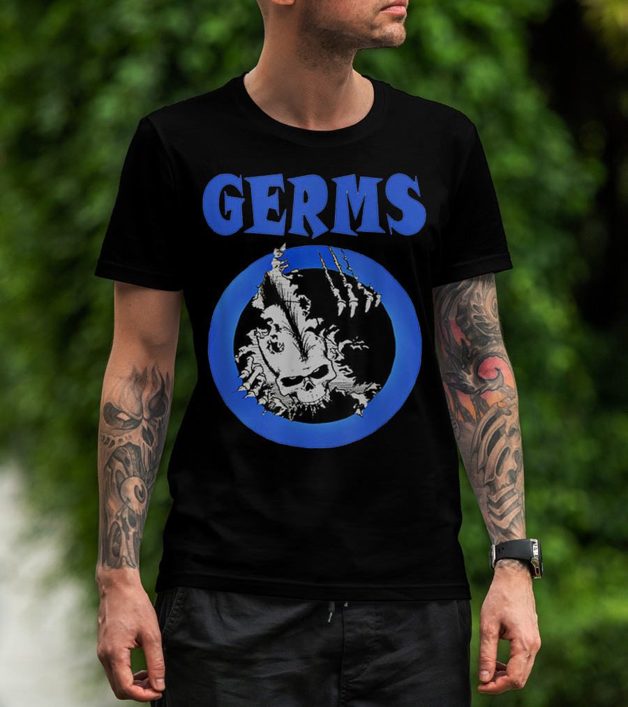 The Germs Punk Rock Cool Skull Symbol with Blue Circle T-shirt is designed for everyday wear and a consistent fit. Fabric is pre-shrunk ring-spun cotton with durable stitching. See the size chart below for exact measurements.