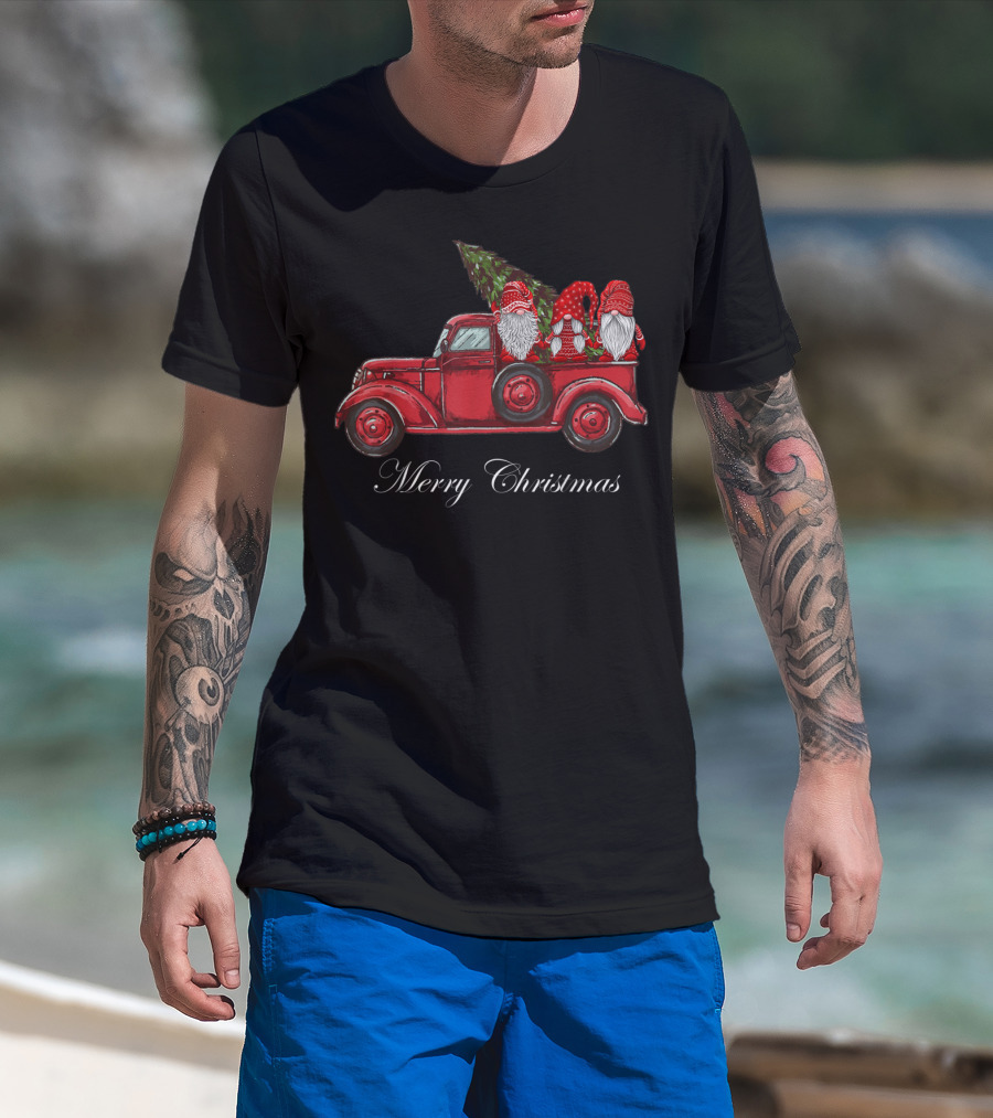 Three Gnomes In Red Truck With Merry Christmas Wishes T-Shirt