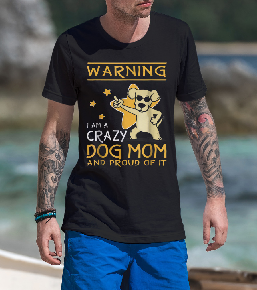 Warning I Am A Crazy Dog Mom And Proud Of It With Playful Cartoon Dog And Stars T-Shirt